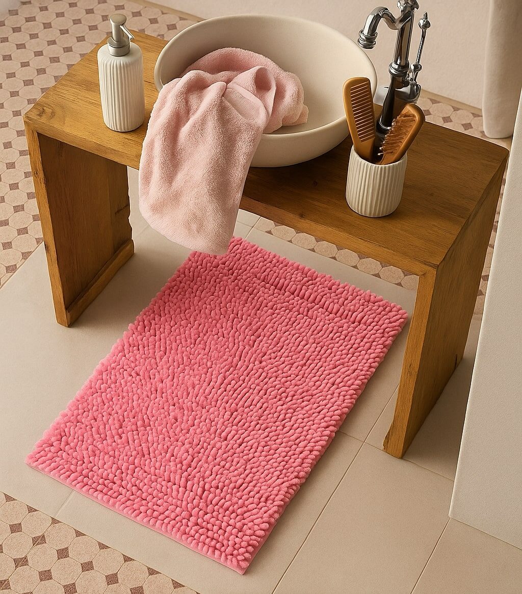 Its soft, “pebble” texture offers excellent absorbency and a unique feel underfoot, while its non-slip base ensures stability and safety after bathing. The elegant pink color fits perfectly into any decor style — from minimal and natural to more urban bathrooms.
