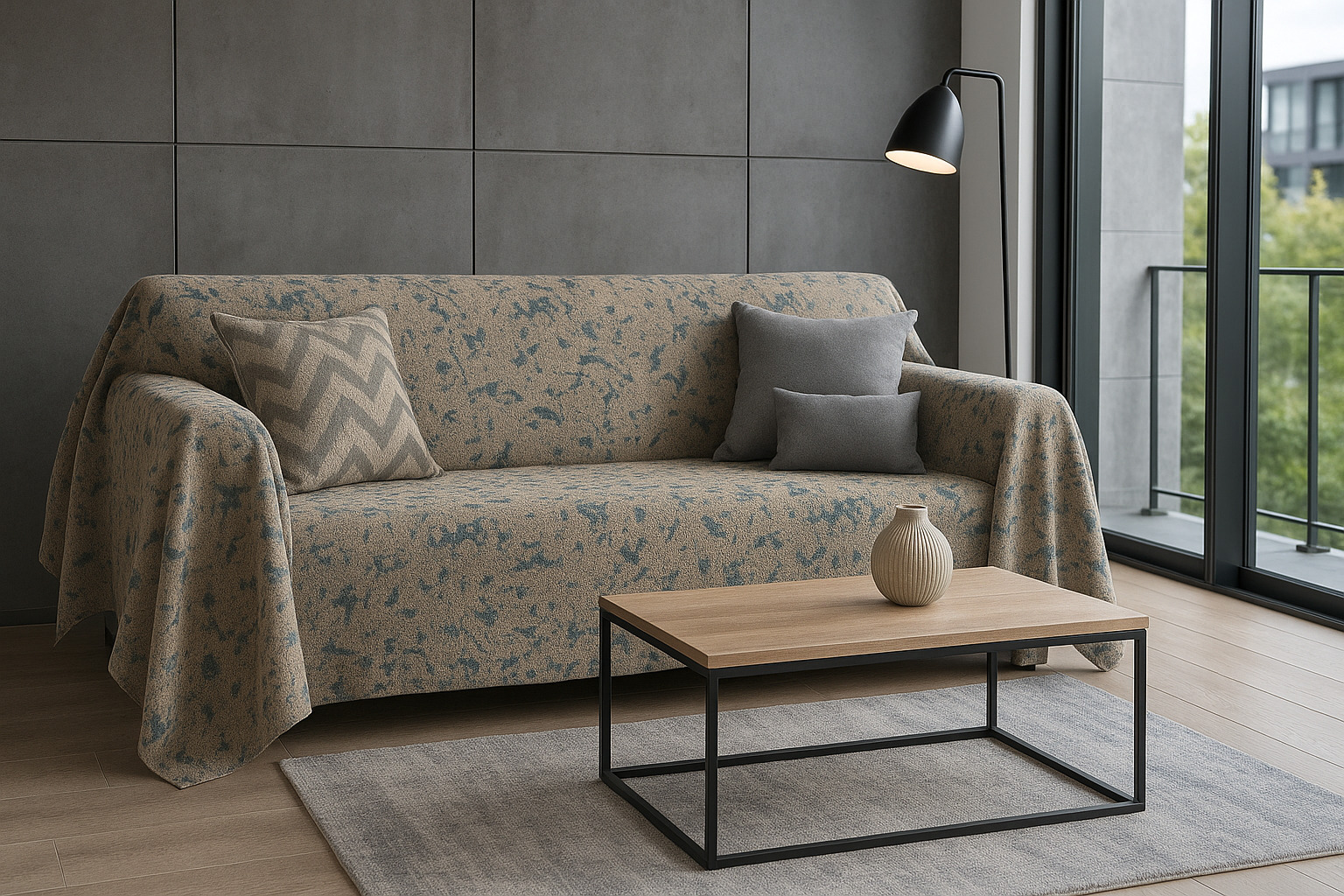 The natural shades of beige, with embossed blue touches, give a sense of calm and luxury, while the soft fabric beautifully embraces your sofa, offering comfort and elegance.