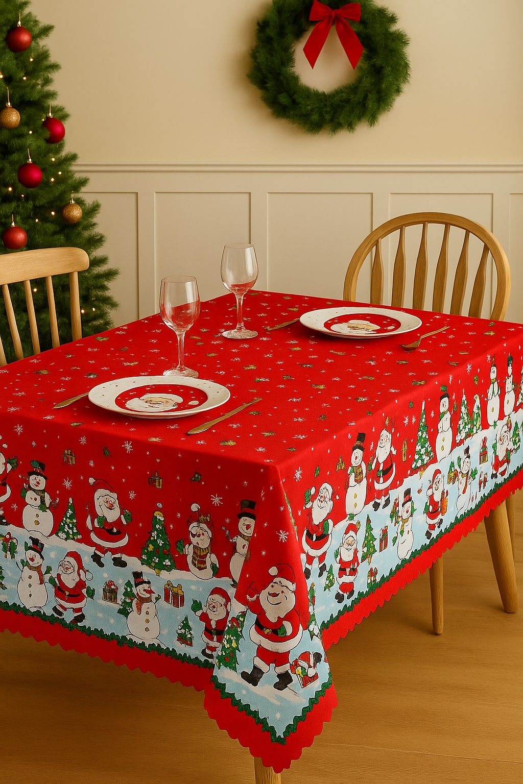 Fill your home with joy and festive mood with the “Santa & Snowmen Parade” tablecloth!