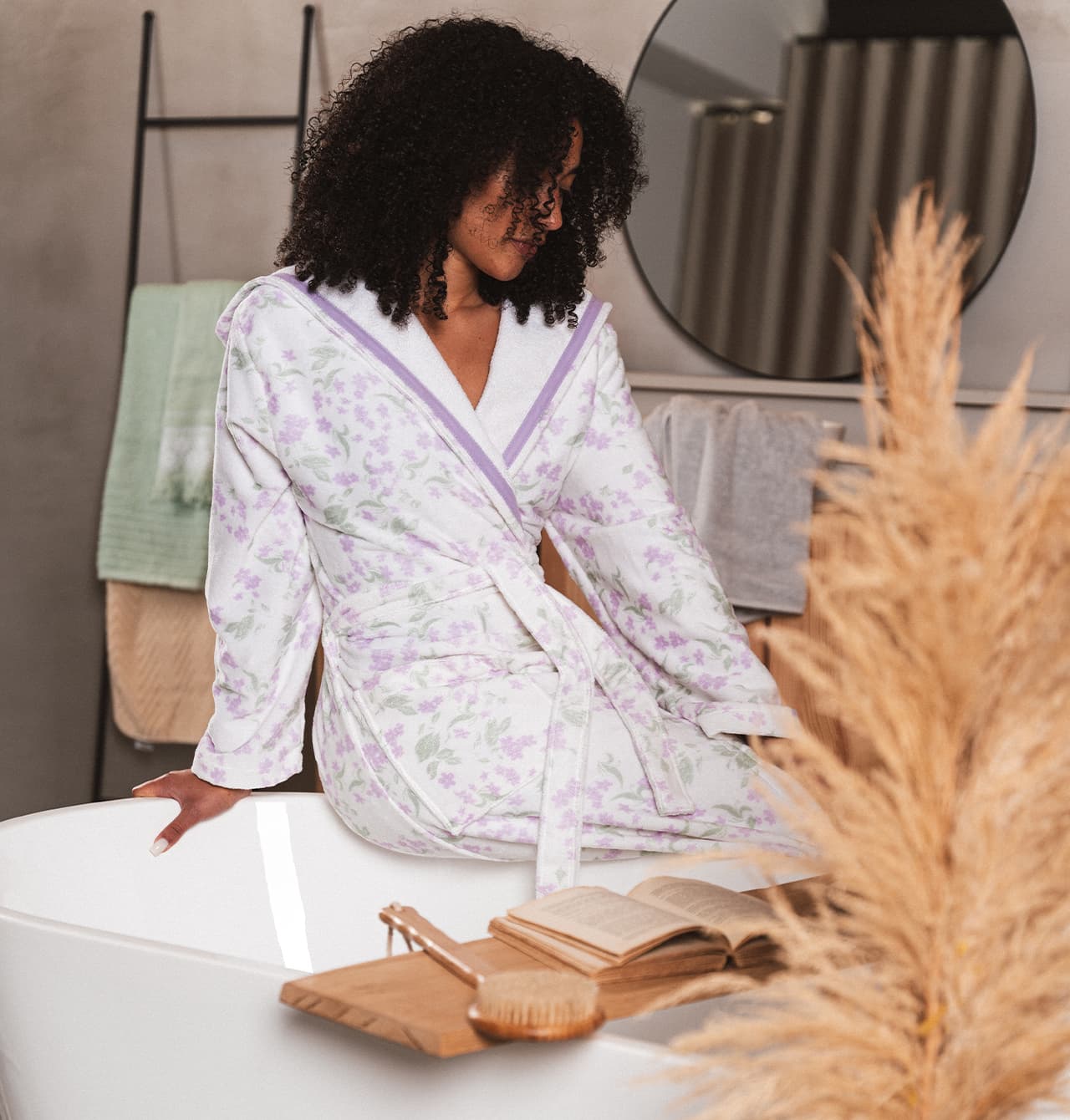 Μπουρνούζι Anais με ρομαντικό λουλουδάτο σχέδιο σε λιλά και πράσινες αποχρώσεις.