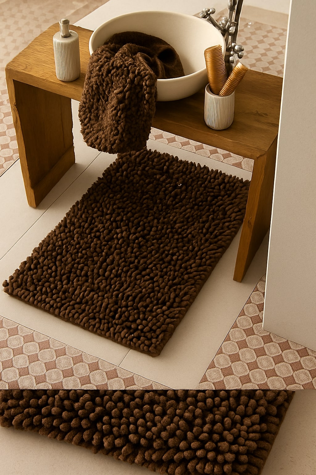 Η απαλή, “pebble” υφή του προσφέρει εξαιρετική απορροφητικότητα και μοναδική αίσθηση κάτω από τα πόδια, ενώ η αντιολισθητική βάση του εξασφαλίζει σταθερότητα και ασφάλεια μετά το μπάνιο. Το κομψό καφέ χρώμα ταιριάζει ιδανικά σε κάθε ύφος διακόσμησης — από minimal και φυσικό έως πιο urban μπάνιο.