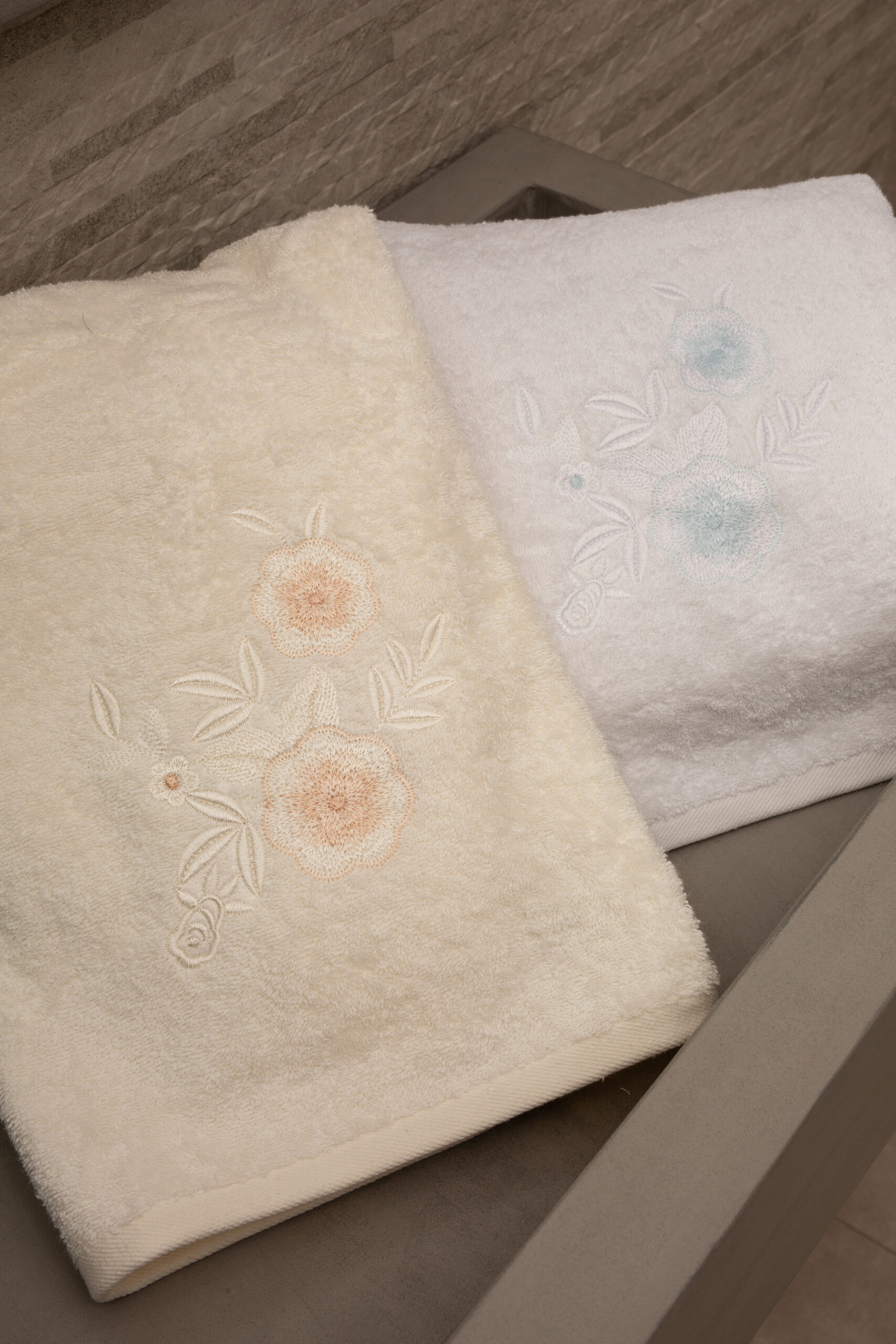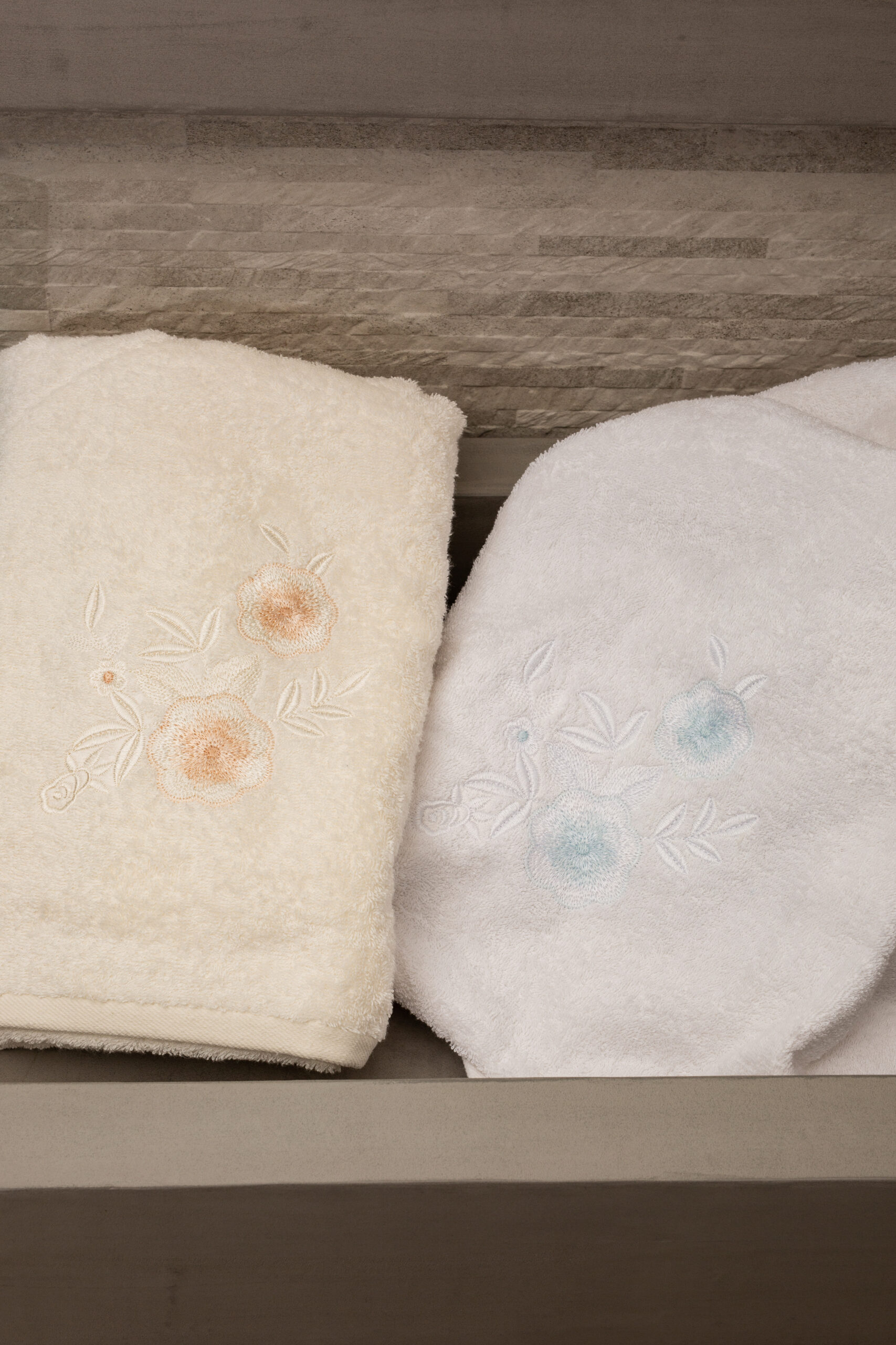 Το βαμβακερό σετ πετσετών “Julia”  έχει ένα διακριτικό  κέντημα απεικονίζοντας λουλούδια tone to tone. Τα χρώματα είναι σε τόνους του γαλάζιου και του μπέζ. Ένα καλαίσθητο σετ με πολυτελή εμφάνιση που θα αναδείξει τον χώρο με την παρουσία του. Προσφέρονται σε σετ τριών τεμαχίων: χεριών, προσώπου και μπάνιου.