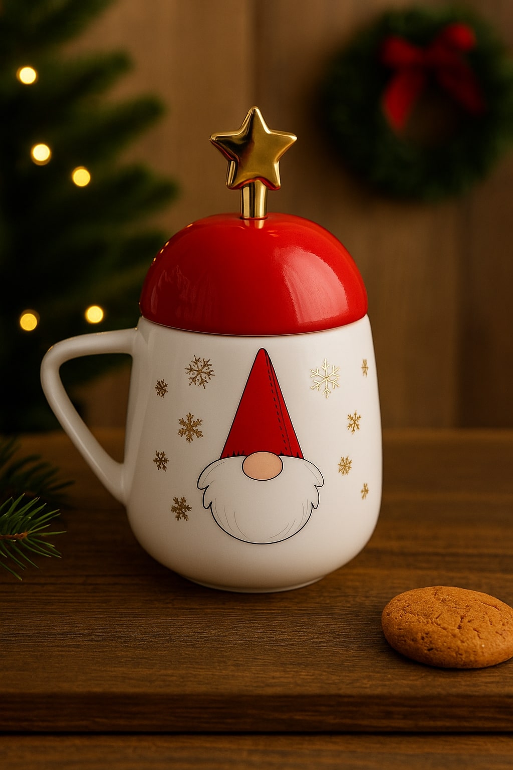 Γιορτινή πορσελάνινη κούπα με καπάκι και κουταλάκι σε σχήμα αστεριού. Διακοσμημένη με τον αγαπημένο Christmas Gnome και χρυσές νιφάδες, ιδανική για καφέ, σοκολάτα ή τσάι. χωρητικότητα 400ml.